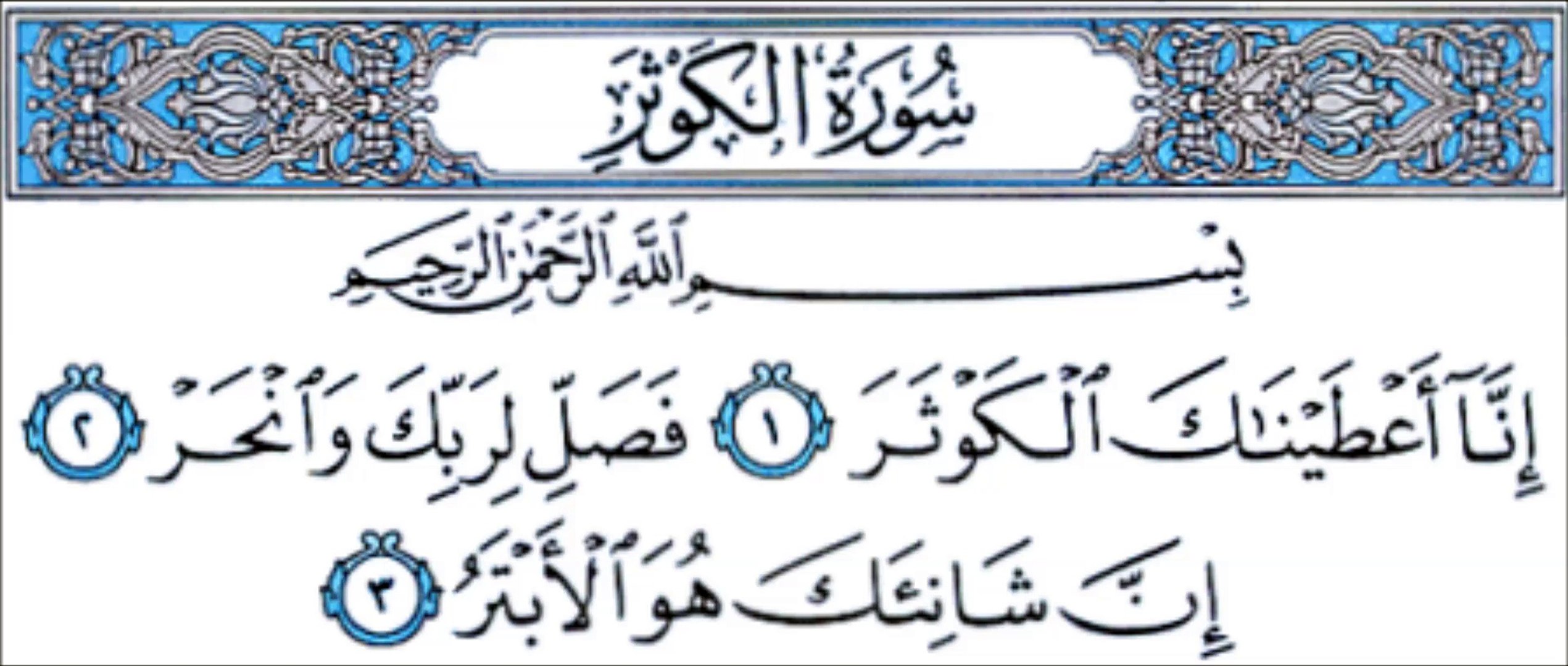 ب س م الل ـه الر ح م ـ ن الر ح يم إ ن ا أ ع ط ي ن اك ال ك و ث ر ١ ف ص ل ل ر ب ك و ان ح ر ٢ إ ن ش ان ئ ك ه و ال أ ب ت ر ٣