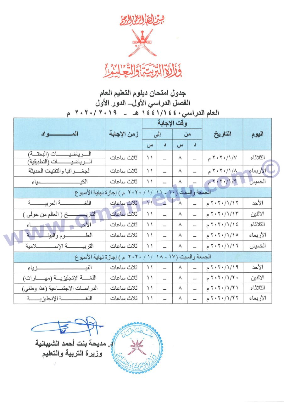 جدول اختبارات الدبلوم العام الثاني عشر سلطنة عمان 2020 الفصل الاول