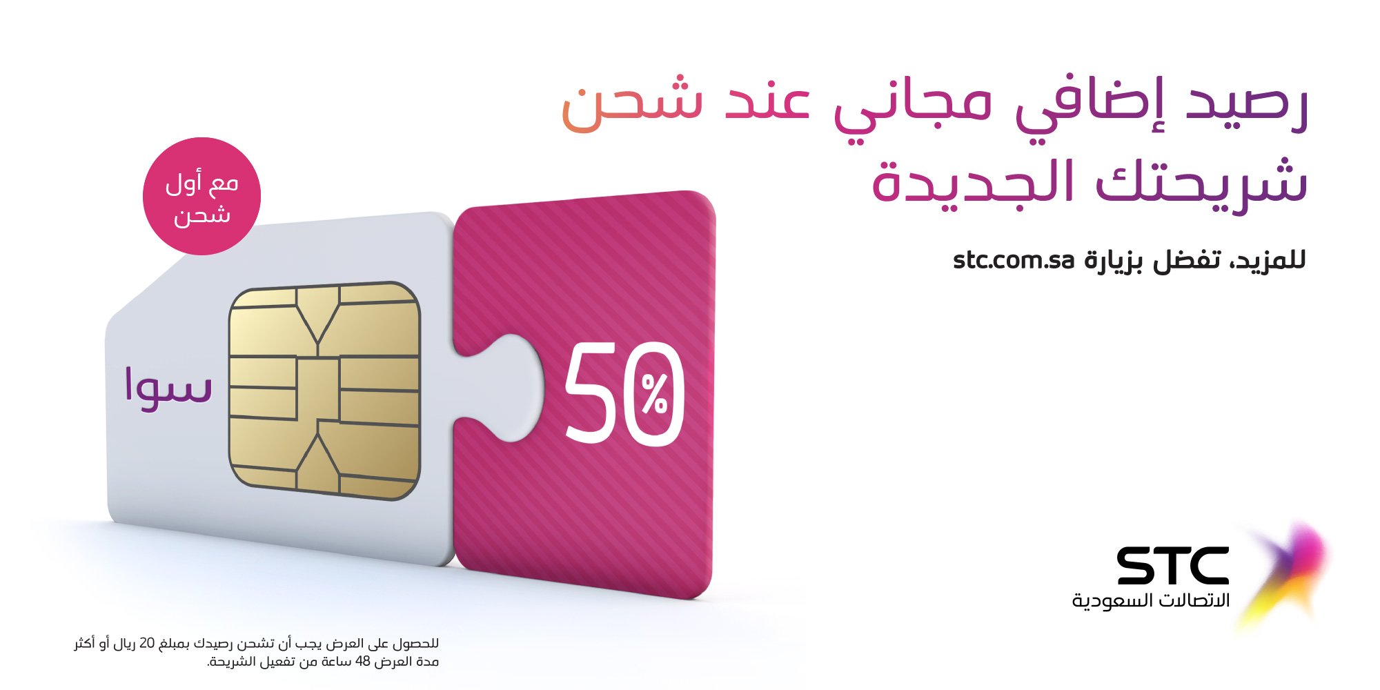 Stc السعودية Twitterren احصل على 50 رصيد إضافي عند شحن شريحة سوا الجديدة العرض يسري على بطاقات شحن سوا 20 ريال وأكثر Https T Co 0dxuhspmqt Https T Co Krgby1g9qe