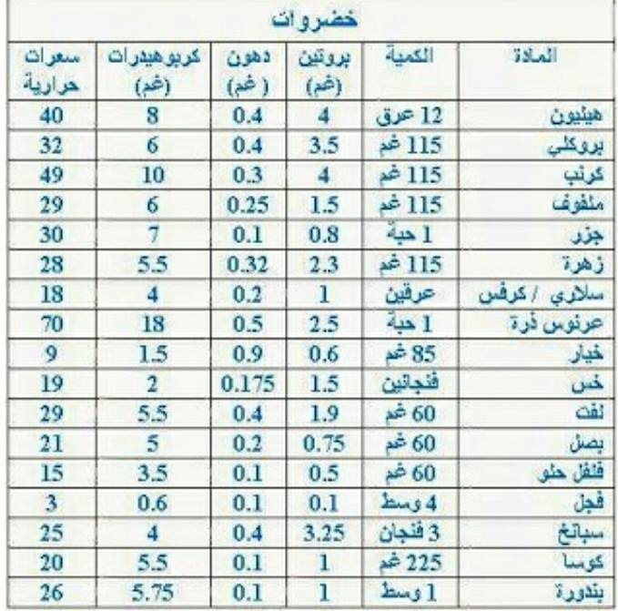 جدول السعرات الحرارية في الاكل أطيب طبخة