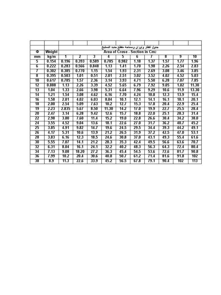 44480178 جدول أقطار وأوزان ومساحة مقطع حديد التسليح